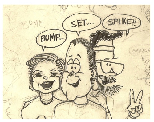 Carol, Josh, and Les - Carol was a good friend, always a joy to be around, and we watched Chitty Chitty Bang Bang together. She didn't play volleyball, but i liked her enough to draw her anyway. Lovely lady.